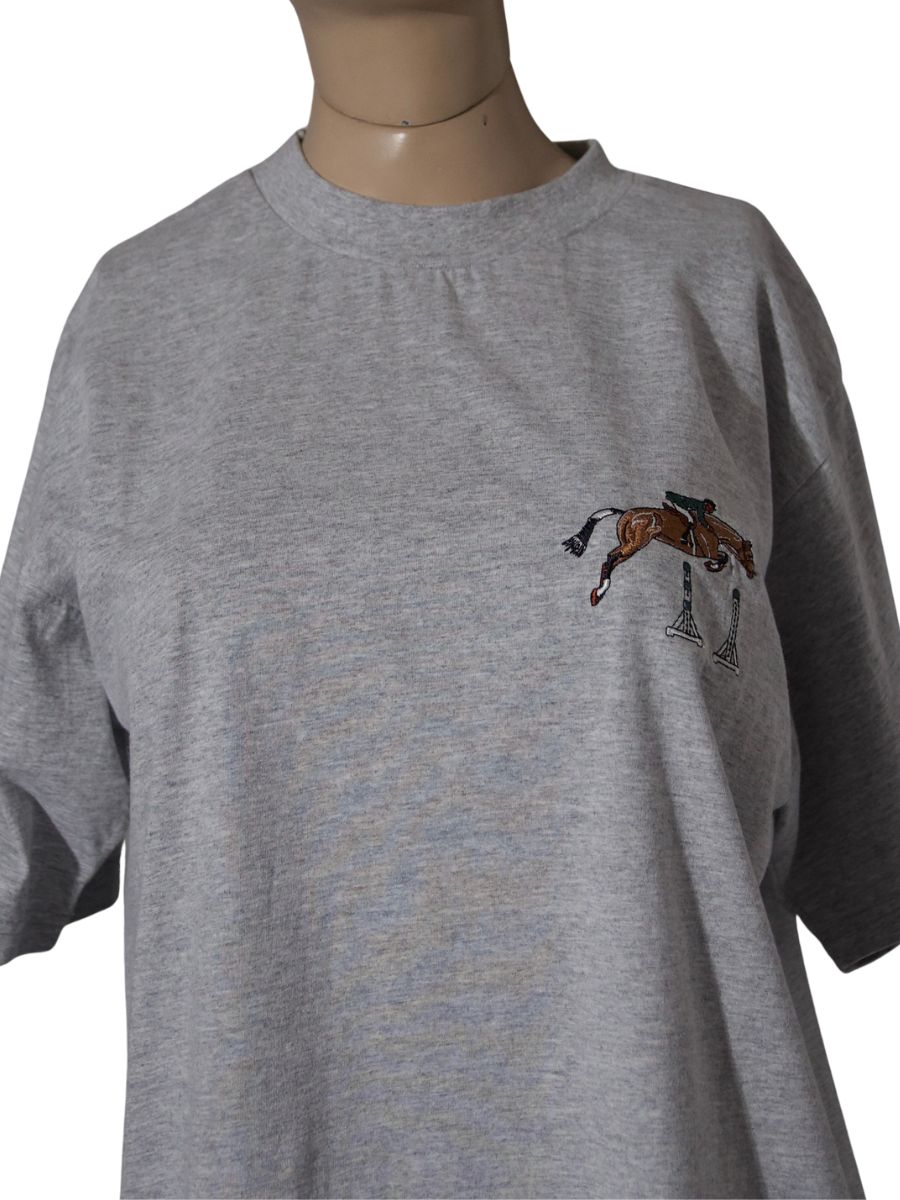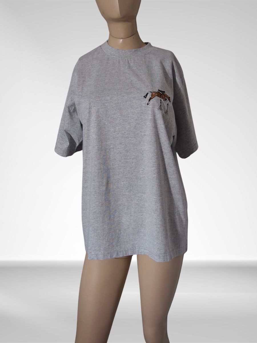 Détails de la pièce — Type : T-shirt équestre — Discipline : CSO (Concours de Saut d’Obstacles) — Fabrication : Made in USA — Taille : M — Couleur : Gris — Motif : Broderie cheval — État : Très bon état — Style : Équestre, sportswear vintage, américain