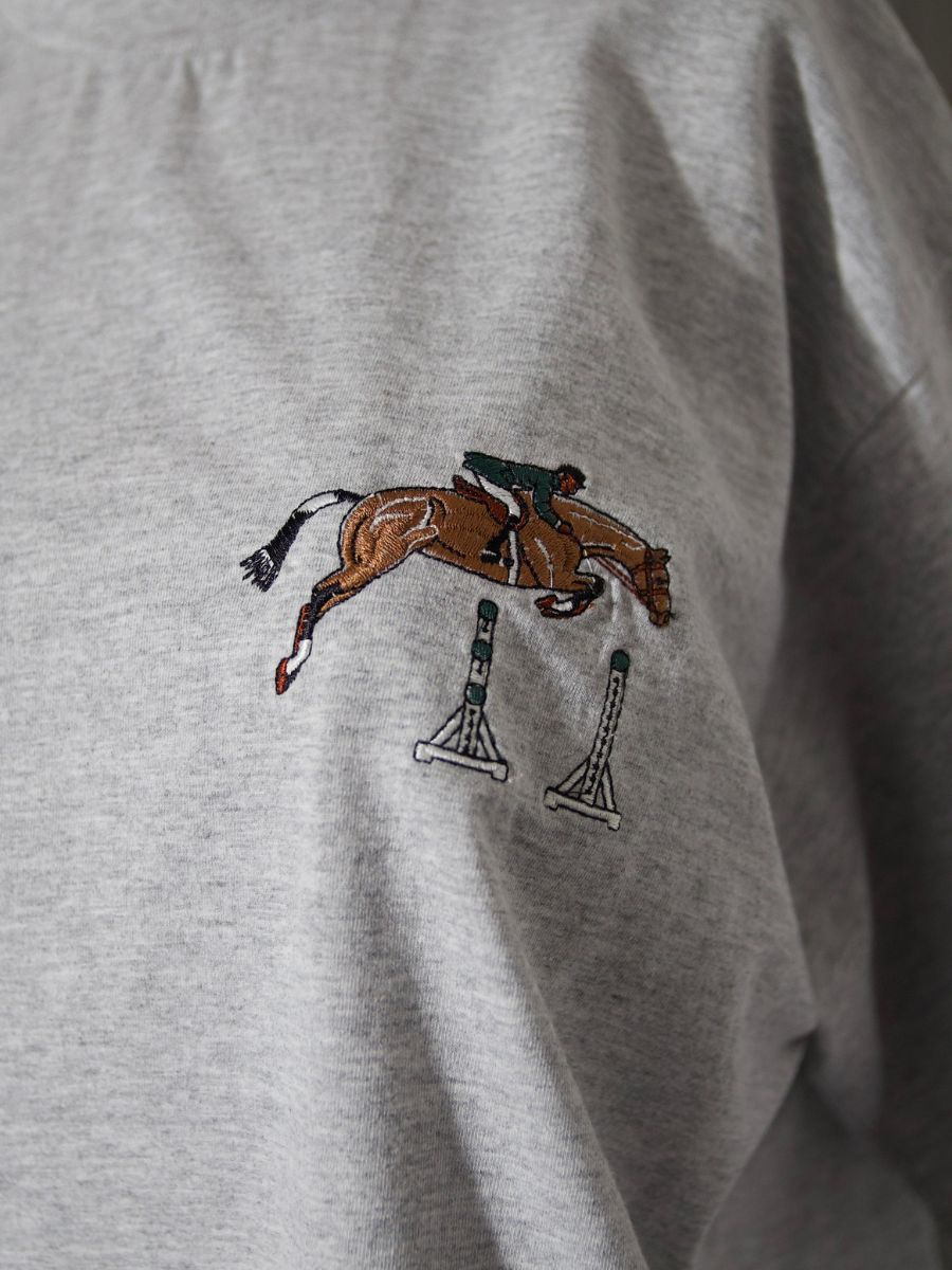 Ce t-shirt gris Made in USA porte une broderie cheval caractéristique de l’univers du CSO (Concours de Saut d’Obstacles) américain. La broderie, plus noble et plus durable qu’un simple print, témoigne de la qualité de fabrication de cette pièce venue directement de la culture équestre sportive américaine. Coupe classique, très bon état de conservation — à porter avec un jean, un pantalon à pince ou un jodhpur pour un look équestre décontracté et authentique.