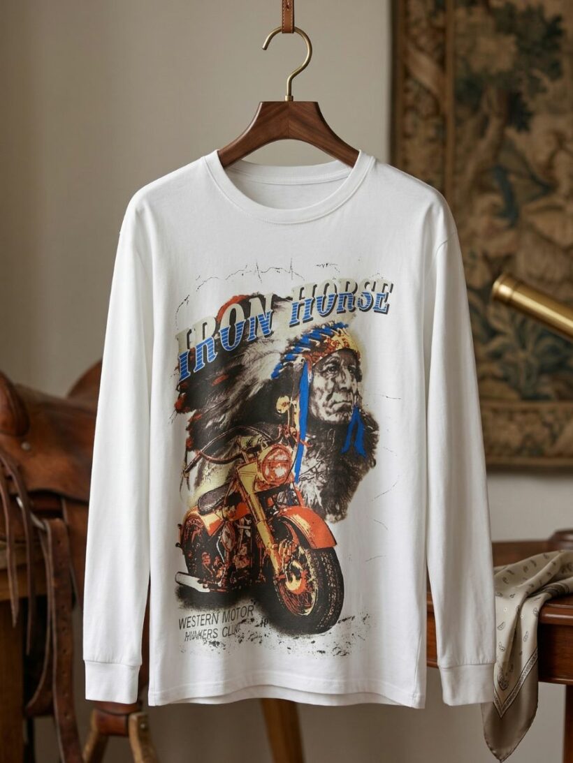 Un t-shirt vintage Iron Horse au caractère affirmé — le biker et le cavalier ont toujours eu plus en commun qu’il n’y paraît.
